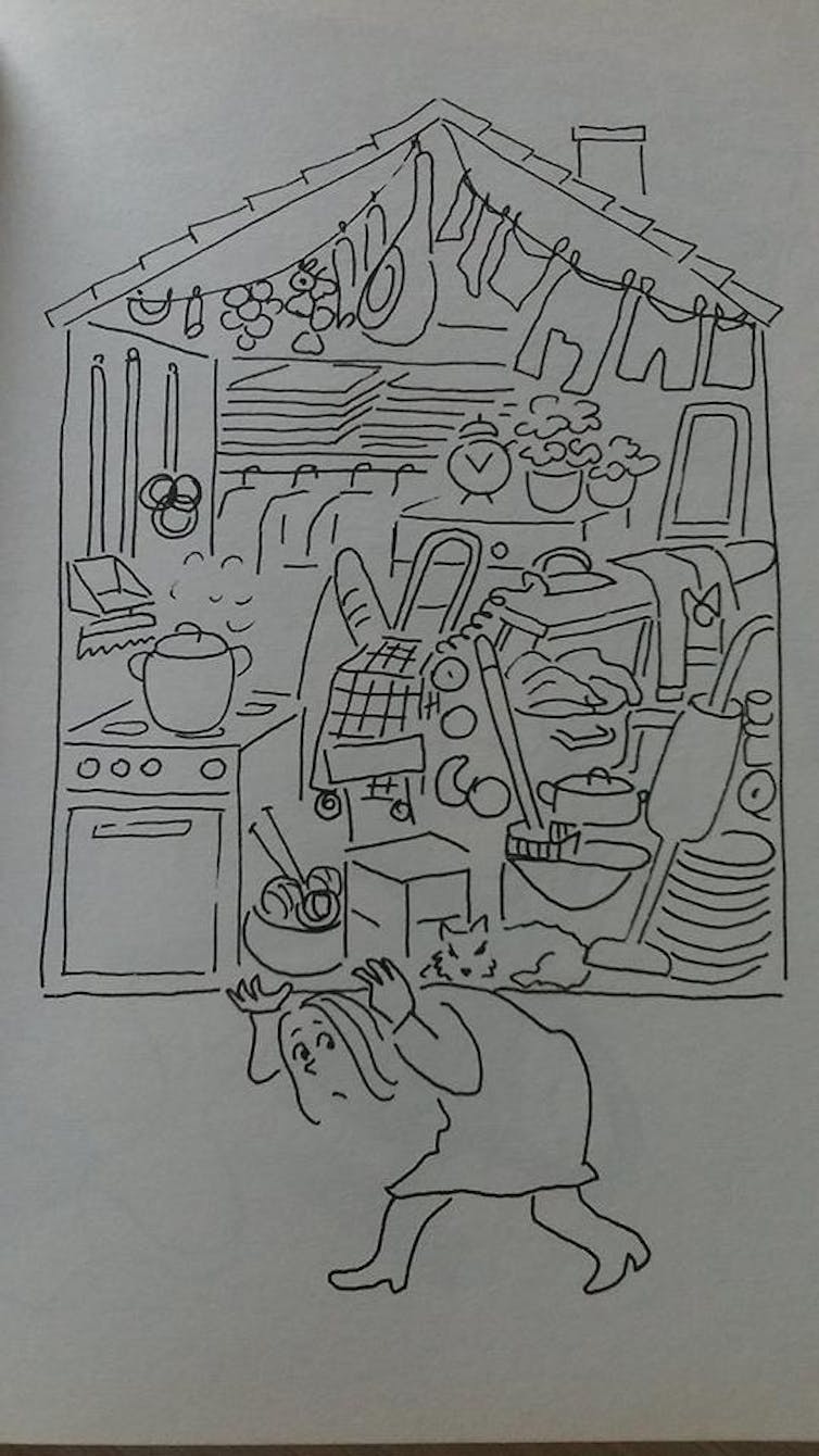L’« ange du foyer » remplit parfaitement son rôle et l’image symbolisant le mieux son asservissement est celle la montrant pliée en deux, portant toute la maison sur ses épaules. Tous les attributs de son statut y apparaissent, que ce soit l’électroménager censé être libérateur, le linge à repasser ou encore le pot-au-feu en train de cuire.