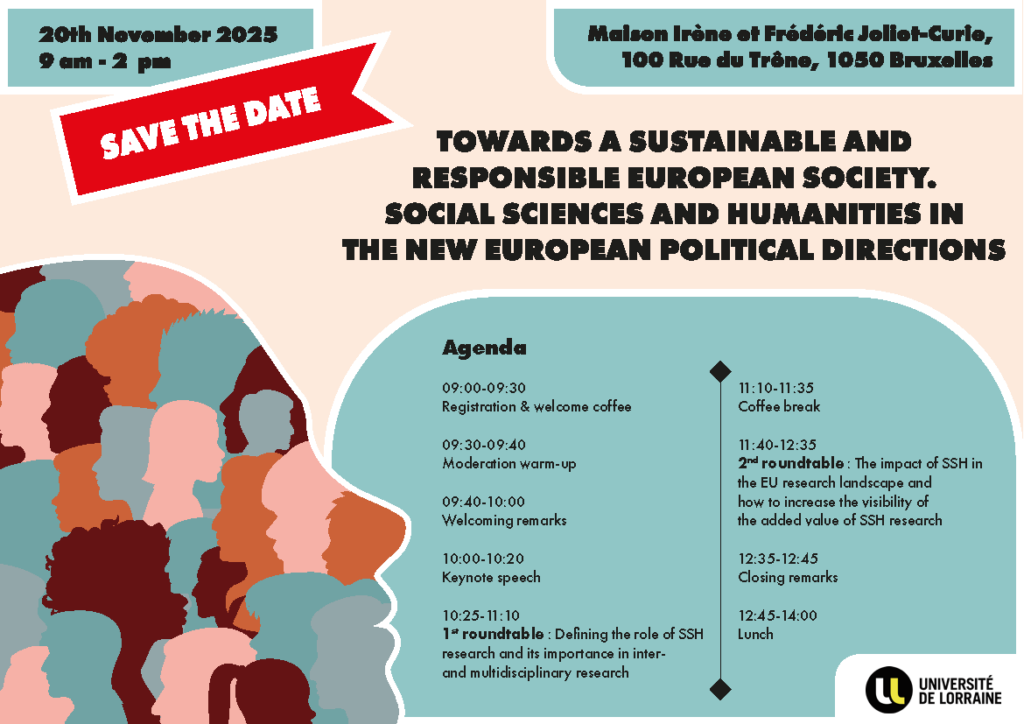 Organisé par l’Université de Lorraine, cet évènement ambitionne de créer un espace de dialogue entre les acteurs européens SHS, afin de contribuer à leur repositionnement stratégique et de co-construire une vision commune pour l’avenir. Il réunira des représentants des institutions européennes, du monde de la recherche et de l’innovation, ainsi que de l’enseignement supérieur.