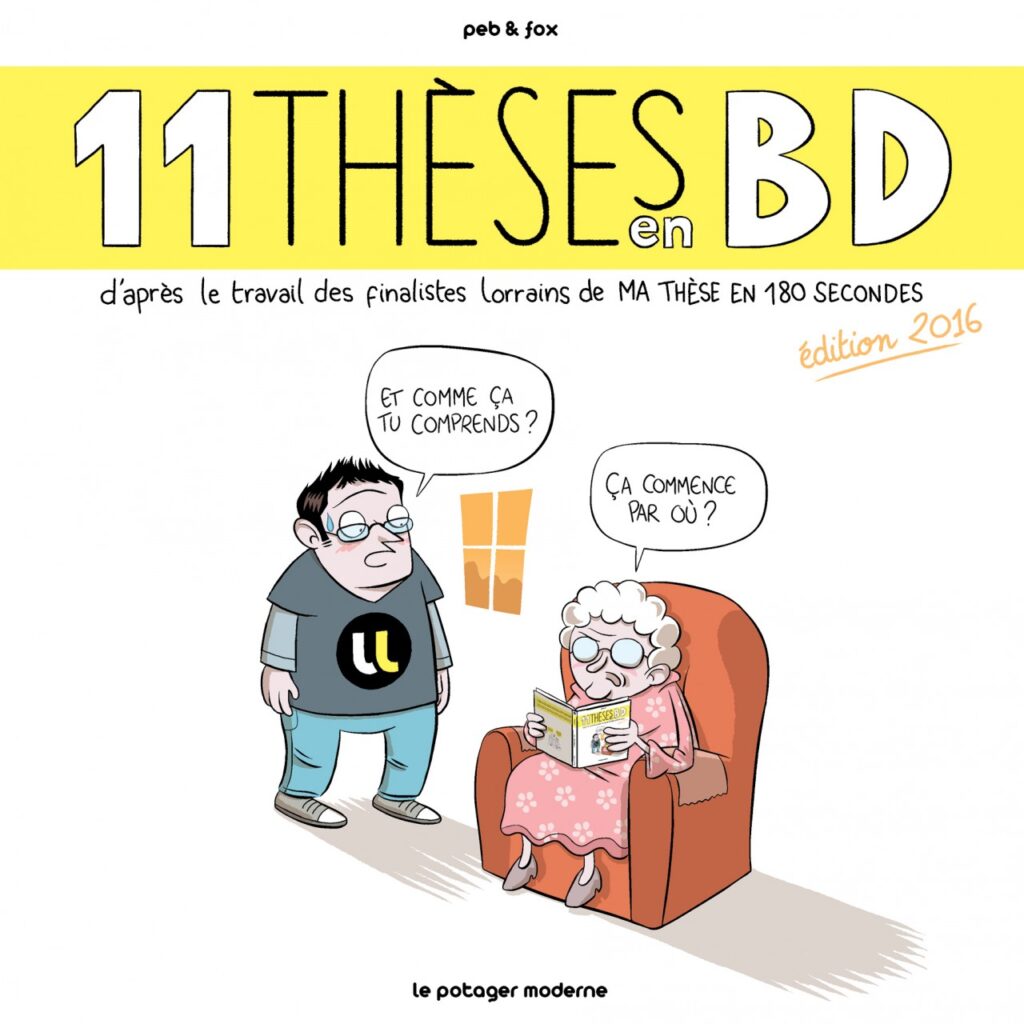 À l’occasion de la finale de l’Université de Lorraine au concours Ma thèse en 180 secondes 2016, l’université s’est tourné vers le duo de dessinateurs Peb & Fox pour adapter en bande-dessinée les projets de recherches des 11 doctorants finalistes.