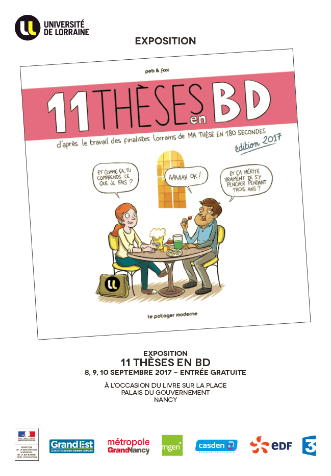 À l’occasion du Livre sur la place, découvrez la nouvelle exposition 11 Thèses en BD 2017 adaptée de la bande-dessinée réalisée par le duo de dessinateurs Peb&Fox pour la finale de l’Université de Lorraine au concours Ma thèse en 180 secondes 2017.