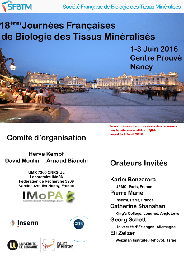 La Sociéte Française de Biologie des Tissus Minéralisés organise cette année son congrès annuel à Nancy du 01 au 03 Juin 2016 au Centre Prouvé. Cet événement réunira environ 150 scientifiques et cliniciens français et internationaux impliqués dans des thématiques riches et variées que les pathologies ostéoarticulaires et cardiovasculaires, la médecine régénératrice, les biomatériaux ou le cancer.