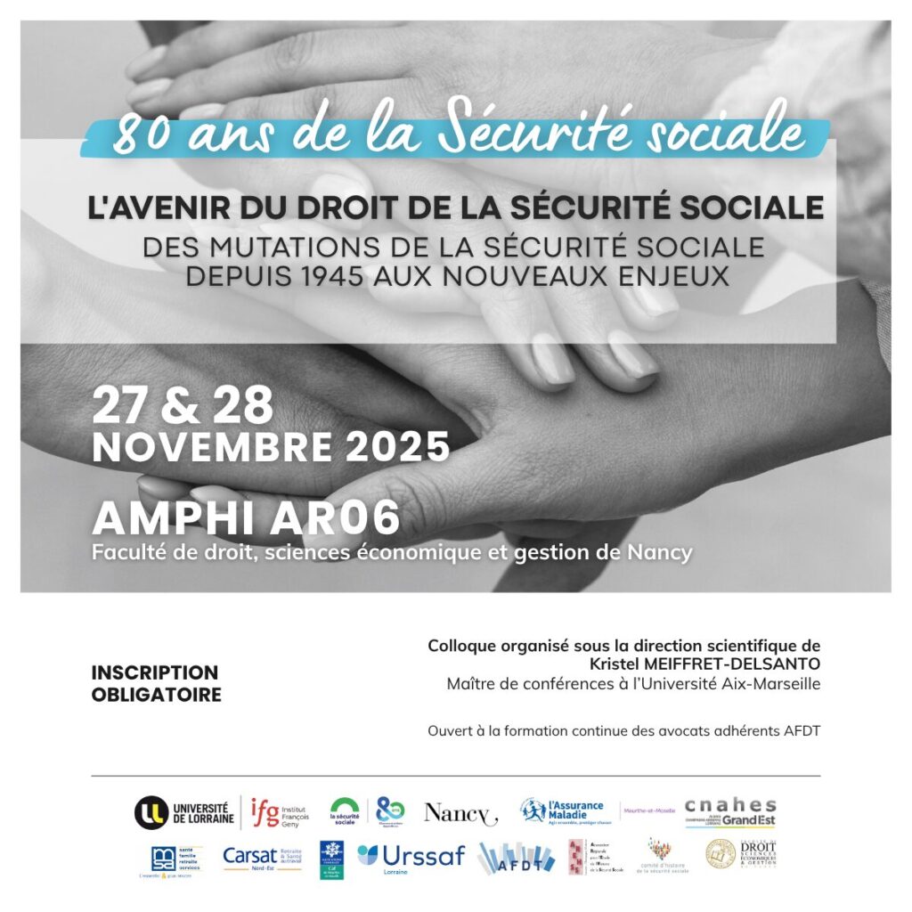 L’Association Française du Droit du Travail (AFDT), L’Institut François Geny (IFG), l’Association Régionale pour l’Étude de l’Histoire de la Sécurité Sociale (AREHSS), le CNAHES, le Comité national d’Histoire de la sécurité sociale, Le Copil des 80 ans de la Sécurité sociale (EN3S), les organismes locaux de sécurité sociale du Grand-Est, la Mairie de Nancy et l’Institut Régional du Travail (IRT) de Nancy organisent un colloque scientifique, interdisciplinaire et citoyen pour réfléchir ensemble à l’avenir de la sécurité sociale.
