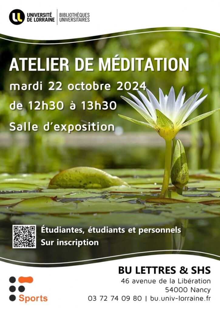 La BU Lettres & SHS vous propose un atelier nomade de relaxation animé par Cathy Hechner, enseignante au SUAPS du l’Université de Lorraine, le 22 octobre 2024 de 12h30 à 13h30.