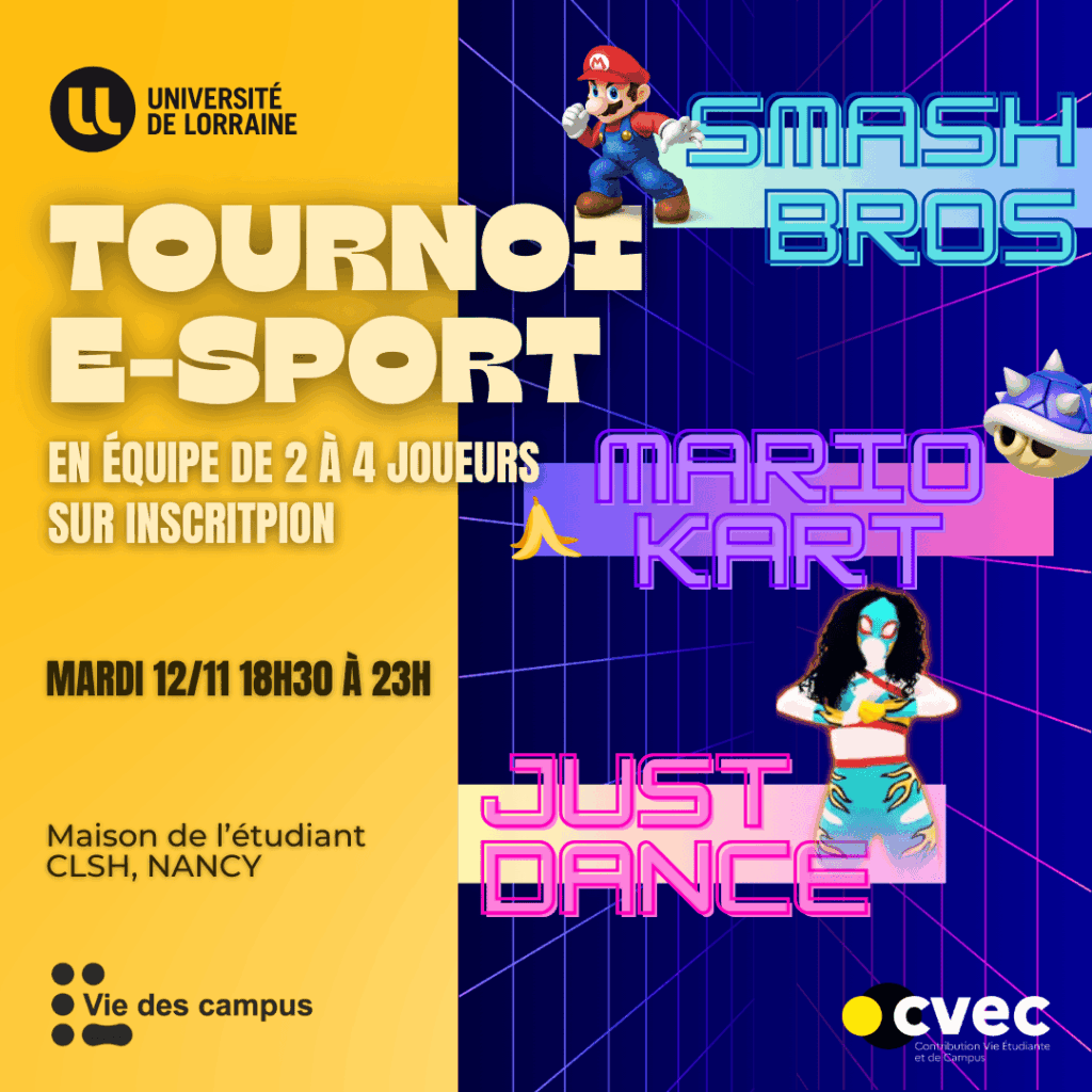 Ta Maison de l’Étudiant LS te propose de venir participer à un tournoi E-sport multi-jeux le mardi 12 novembre 2024 de 18h30 à 23h !