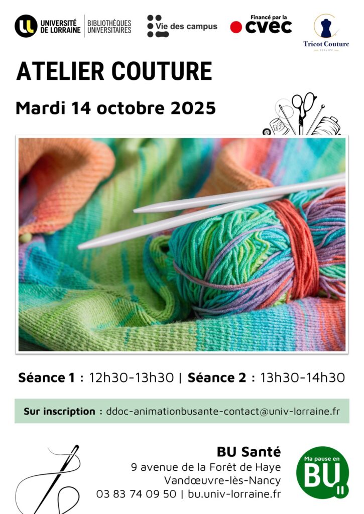 La BU Santé vous propose un nouvel atelier couture et upcycling le mardi 14 octobre, de 12h30 à 14h30. Cette animation est organisée en partenariat avec l’association Tricot Couture Services.