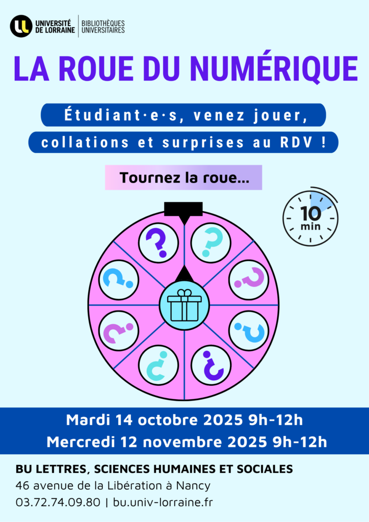 La BU Lettres, Sciences Humaines et Sociales de Nancy organise la deuxième édition de « La roue du numérique », animation ludique autour des ressources numériques.