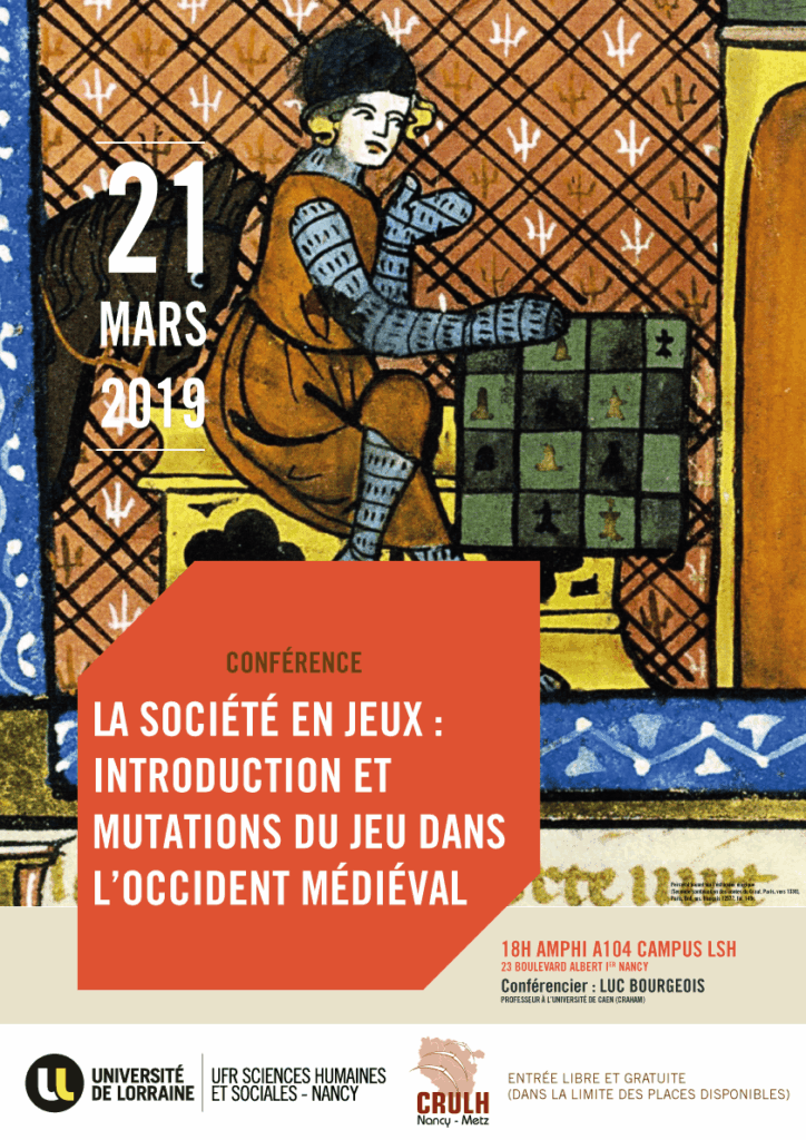 Lors de cette deuxième conférence du cycle ARTIFEX de l’année 2018-2019, nous aurons le plaisir d’écouter M. Luc Bourgeois, professeur d’archéologie médiévale à l’université de Caen-Normandie (centre Michel de Boüard – CRAHAM), qui évoquera la question du jeu et de son évolution dans la société de l’Occident médiéval. La conférence aura lieu le jeudi 21 mars 2019 à 18h sur le campus Lettres et Sciences Humaines de Nancy (salle A104).