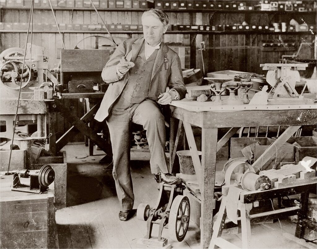 Fondateur, à Menlo Park, d’un creuset expérimental annonçant nos laboratoires de recherche et développement, épaulé par quelques jeunes collaborateurs d’exception dans une atmosphère conviviale, le trentenaire se mue en inventeur frénétique – il déposera mille quatre-vingt-treize brevets sur le seul territoire américain. Pour ce tempérament enthousiaste, l’échec n’a rien de négatif : il indique simplement une voie dans laquelle il conviendra de ne plus s’entêter, ce que reflète l’aphorisme apocryphe « le génie est fait d’un pour cent d’inspiration et de quatre-vingt-dix-neuf pour cent de transpiration ». Force est de constater qu’Edison ne ménage pas sa peine : dans un siècle qui a vu la photographie dépasser la peinture en matière de capture d’image, il offre à ses contemporains l’enregistrement de la voix. Le phonographe assure la gloire à son concepteur, qui, convaincu du rôle promis à l’électricité au quotidien, se penche également sur la transmission de l’énergie à distance, permise par la dynamo, et parvient, grâce à l’ampoule électrique, à « diviser la lumière », quand nombre de ses prédécesseurs ont échoué. De l’actrice Sarah Bernhardt en visite, au richissime John Pierpont Morgan, qui, le premier, équipe sa résidence new-yorkaise de lampes à incandescence, les plus grands noms de la fin du dix-neuvième siècle saluent la réussite d’Edison.
