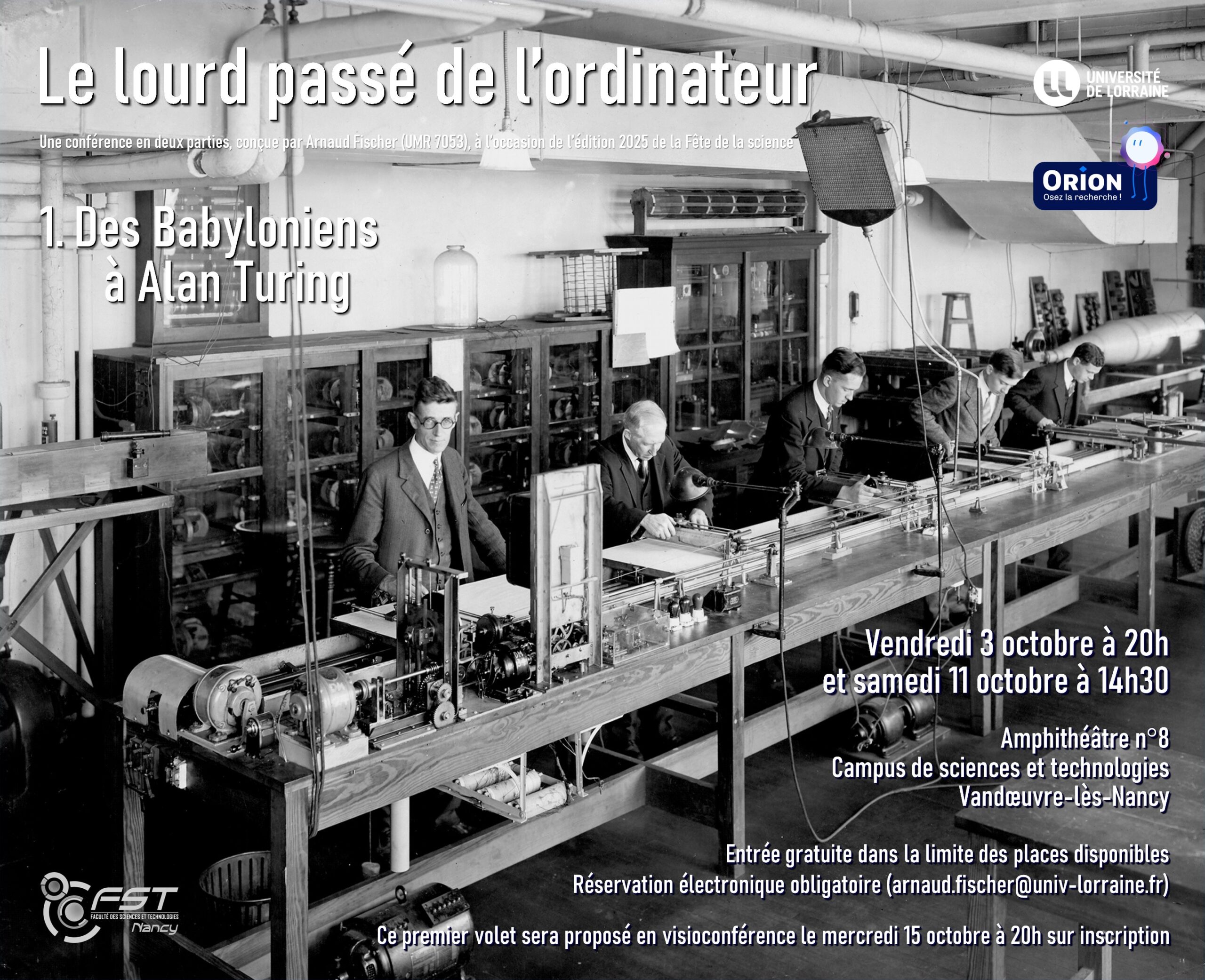 Le premier volet, baptisé « Des Babyloniens à Alan Turing », sera proposé le vendredi 3 octobre à 20h et le samedi 11 octobre à 14h30, en amphithéâtre n°8 du campus de sciences et technologies de Vandœuvre-lès-Nancy.