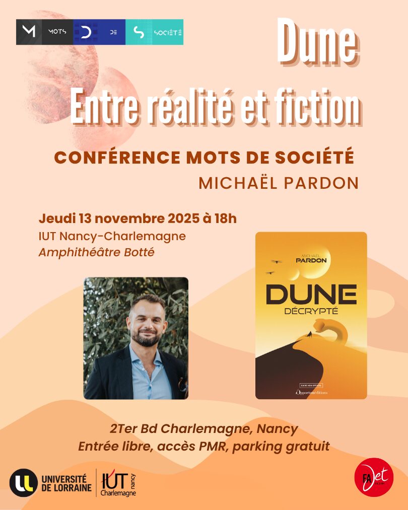 Le cycle Mots de Société présente des conférences sur des thèmes de société actuels, organisées par les étudiants en Métiers du Livre et du Patrimoine de l’IUT Nancy-Charlemagne. C’est dans ce cadre que l’IUT accueillera Michaël PARDON, auteur de l’ouvrage Dune décrypté, publié par la maison d’édition L’Opportun en 2025.