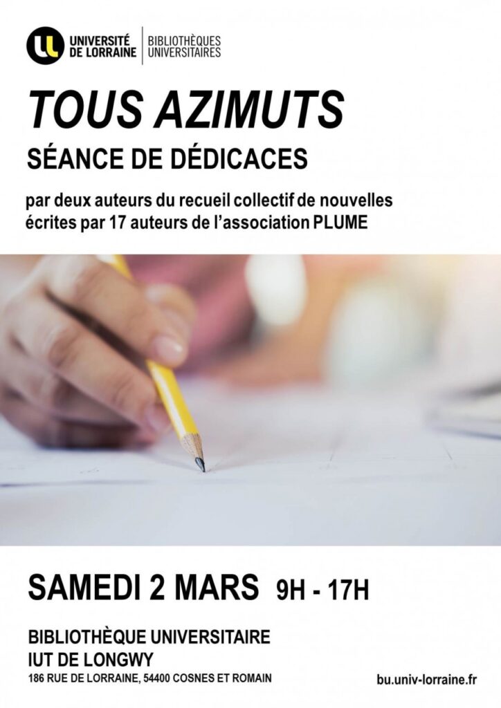 A l’occasion de la Journée Portes Ouvertes organisée à l’IUT de Longwy le samedi 2 mars, la bibliothèque de l’IUT accueille deux auteurs, Diane DIDELOT responsable de la bibliothèque de l’IUT de Longwy et écrivaine et Robert THOMAS, écrivain, de l’association PLUME qui viennent présenter et dédicacer un recueil collectif de nouvelles auxquels ils ont participé, édité par l’association PLUME (Passion Littéraire de l’Union Meusienne des Ecrivains et Illustrateurs).