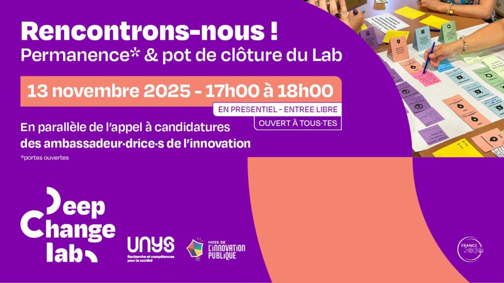 Dans le cadre du Mois de l’innovation publique* venez rencontrer l’équipe du Deep Change Lab et les ambassadeur·drice·s de l’innovation lors d’une de ses permanences (entrée libre, ouverte à tous·tes), dans ses locaux, durant ses portes ouvertes et exposition. Cet évènement est accessible aux agent·e·s des établissements du site lorrain de recherche (UL, CNRS, INRIA, INRAE, INSERM, CHRU, GeorgiaTech Europe et AgroParisTech) et à l’ensemble des acteur·trice· s externe (citoyen·ne·s, étudiant·e·s, doctorant·e·s, ingénieur·e·s, designer·e·s, chargé·e·s de projet, curieux·ses etc.).