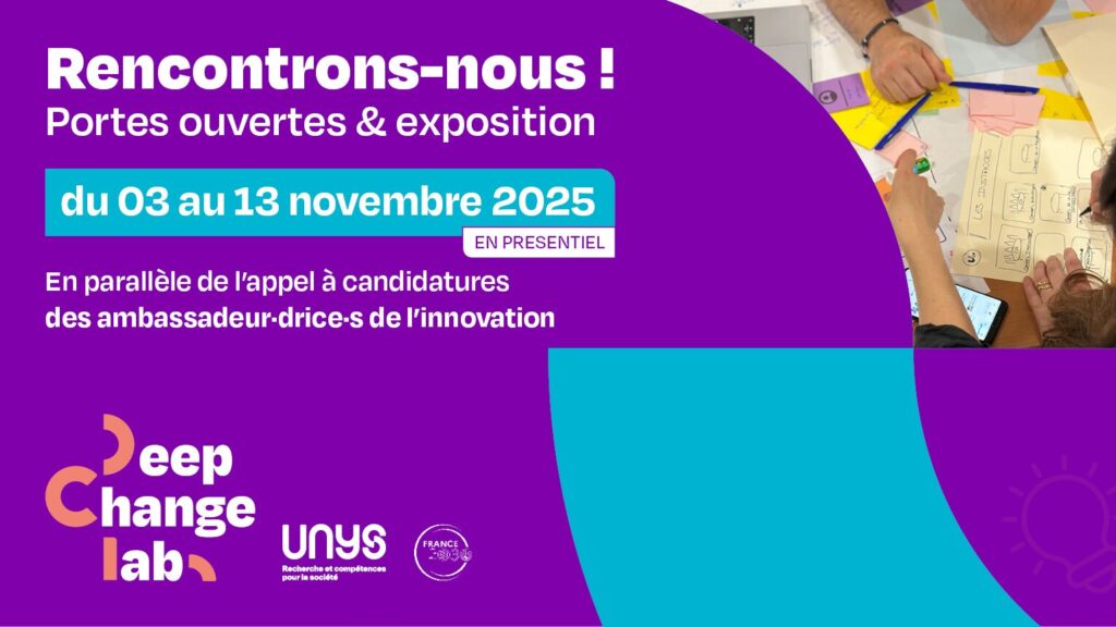 Dans le cadre du Mois de l’innovation publique* et à l’occasion du lancement de son appel à candidatures des ambassadeur·drice·s de l’innovation 2026-2028, le Deep Change Lab (laboratoire d’innovation publique du site lorrain de recherche) vous ouvre ses portes du 3 au 13 novembre 2025 !