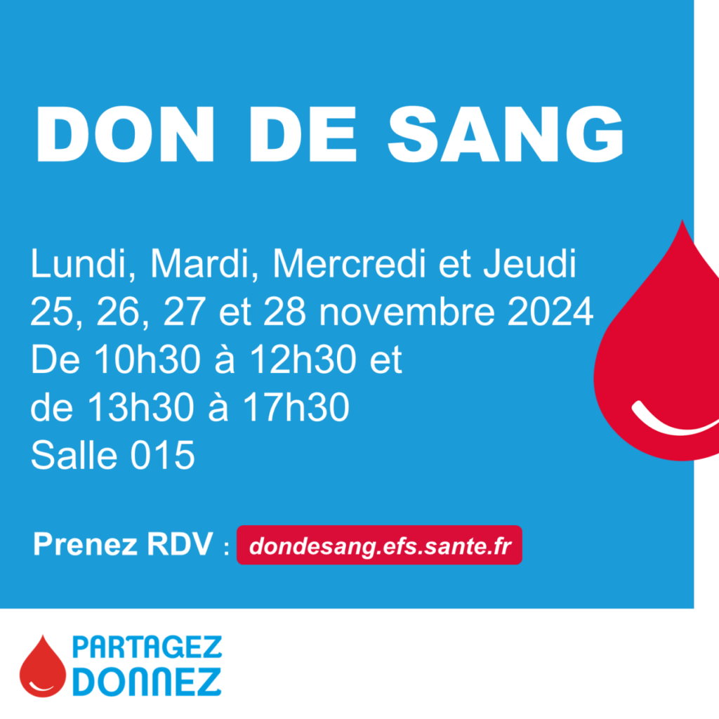 Venez donner votre sang lundi 25, mardi 26, mercredi 27 et jeudi 28 novembre de 10h30 à 12h30 et de 13h30 à 17h30 en salle A015. Il est impératif de réserver un créneau sur la plateforme suivante : https://dondesang.efs.sante.fr/trouver-une-collecte/116926/sang