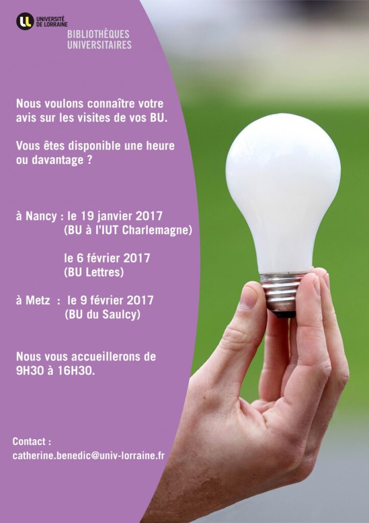 Vous êtes étudiant à l’UL ? Nous sollicitons votre participation à cette réflexion en vous invitant à vous joindre à l’une de nos journées de formation-action organisée les 19 janvier et 6 février à Nancy et le 9 février à Metz. Que vous ayez simplement une heure à y consacrer ou plus, voire toute la journée, votre intervention nous permettra de coconstruire avec vous des formules de visite de BU plus dynamiques !
