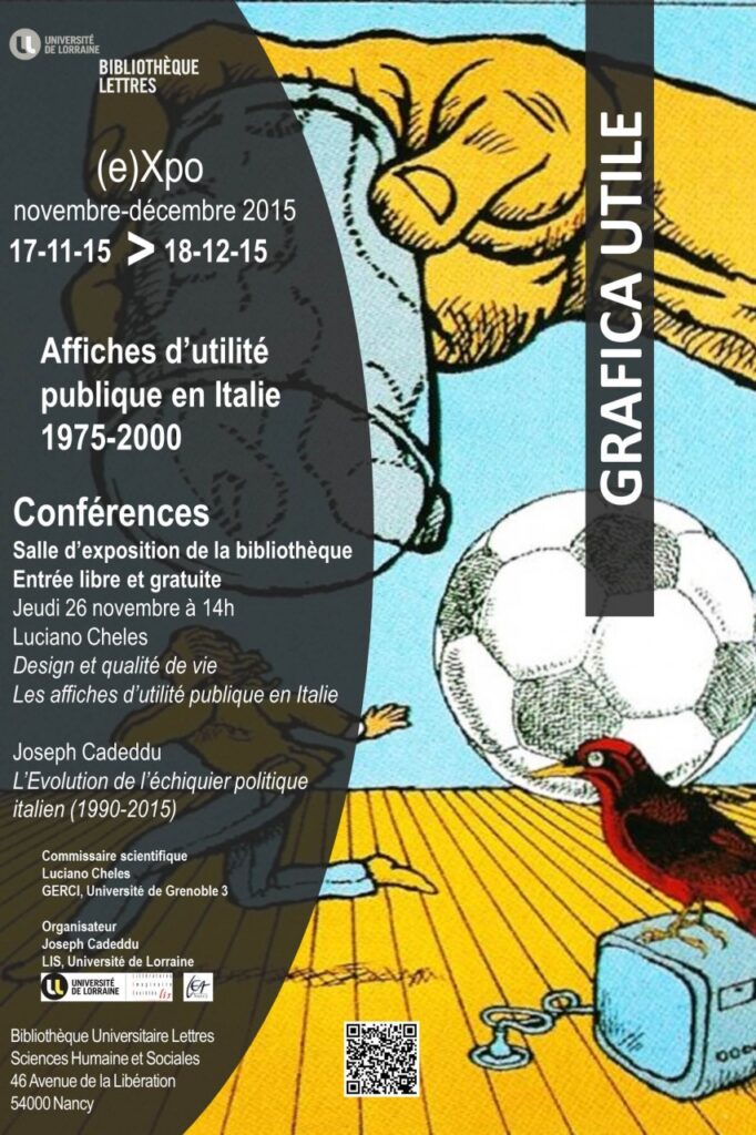 Giuseppe Cadeddu du laboratoire LIS (Littératures, Imaginaire, Sociétés) organise l’événement GRAFICA UTILE. L’environnement, la santé, la sexualité, la paix, la culture et la vie civique dans les affiches d’utilité publique en Italie, 1975-2000 à la Bibliothèque universitaire de lettres du 17 novembre 2015 au 18 décembre 2015.