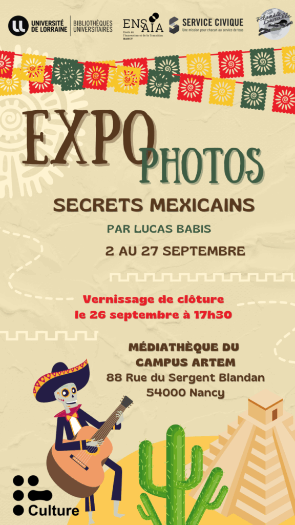 La Médiathèque du campus ARTEM met à l’honneur le Mexique dans l’exposition « Secrets mexicains », à découvrir librement du 2 au 27 septembre 2024.