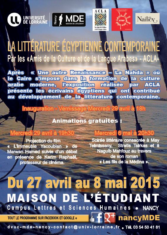 • Mercredi 6 mai 2015 à 20h30 – Soirée littéraire consacrée à May Telmissany,  Stratis Tsirkas et à Naguib Mahfouz au travers de son roman « Les fils de la Médina ».