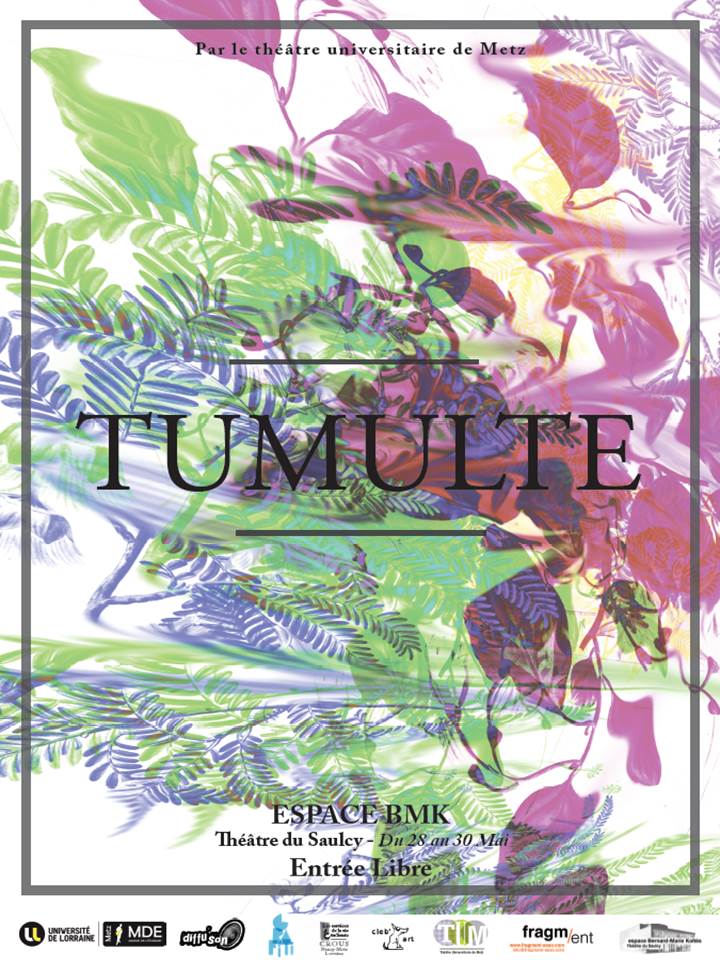 Après les compagnies messines l’année dernière, le festival Tumulte accueillera fin mai des groupes aux démarches artistiques différentes: une pièce du Théâtre Universitaire de Dijon, une mise-en-scène par l’association GrAFiTi, un spectacle programmé par l’association Fragment, une pièce des étudiants du Conservatoire à Rayonnement Régional de Metz, ainsi que deux créations du Théâtre Universitaire de Metz, un concert chaque soir, une scène ouverte et des expositions dans le hall de l’Espace BMK !