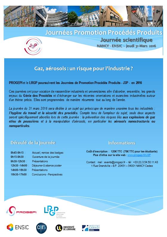 La journée du 31 mars 2016 sera dédiée à un sujet qui préoccupe de manière unanime tous les industriels : l’hygiène du travail et la sécurité des procédés. Compte tenu de l’ampleur du sujet, seuls deux aspects seront spécifiquement abordés lors de cette journée : la prévention des risques liés aux explosions de gaz et/ou de poussières et à la manipulation d’aérosols, en particulier les aérosols nanostructurés ou nanoparticules.