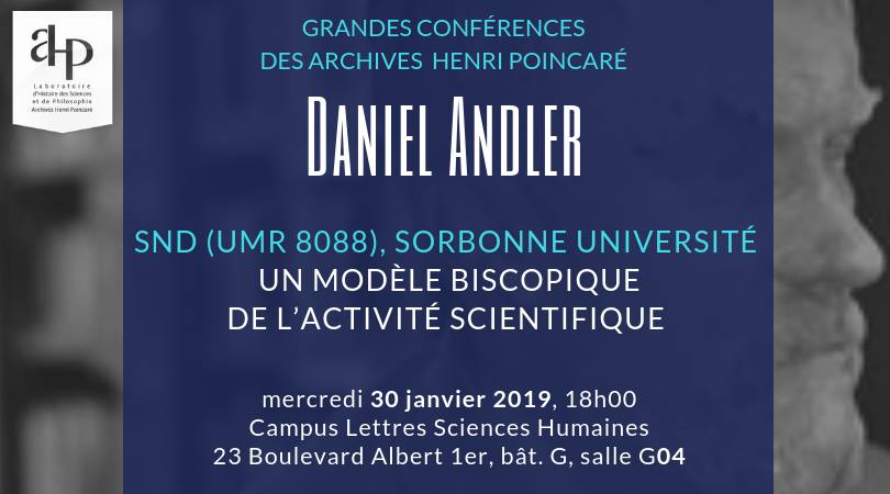 Elle accueillera l’exposé suivant : Daniel ANDLER (SND, UMR 8088, Sorbonne Université) « Un modèle biscopique de l’activité scientifique »