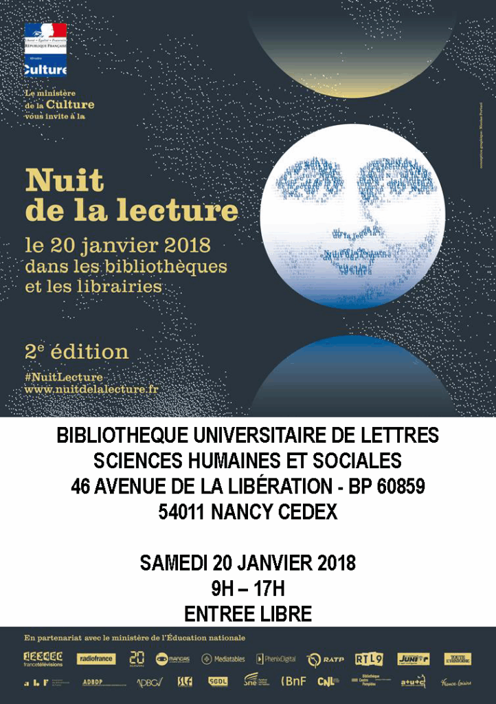 Pour sa deuxième édition, la Nuit de la lecture se déroulera le samedi 20 janvier 2018 dans les bibliothèques et librairies qui proposent plusieurs milliers d’événements partout en France. Toute la journée du samedi 20 janvier 2018 de 9h à 17h à la bibliothèque universitaire de lettres, sciences humaines et sociales de Nancy, vous êtes invités à venir découvrir des auteurs, des lectures, un atelier d’écriture, une troupe d’improvisation, un moment musical, des conférences, des artistes, un éditeur, une exposition. Romans, bandes dessinées, ouvrages scientifiques, nouvelles, contes, science fiction, poésie et cinéma seront les principaux thèmes de cette journée.