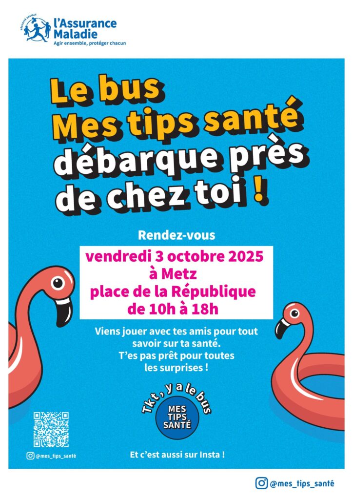 Le bus Mes Tips Santé vous donne rendez-vous le 3 octobre 2025, place de la République à Metz, de 10h à 18h.