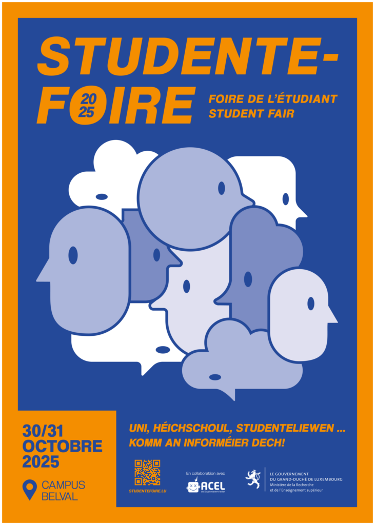Ne manquez pas la Foire de l’Étudiant 2025, le salon incontournable de l’orientation qui se tiendra sur le campus de Belval (Luxembourg) les Jeudi 30 octobre (9h-18h) et Vendredi 31 octobre (9h-16h).