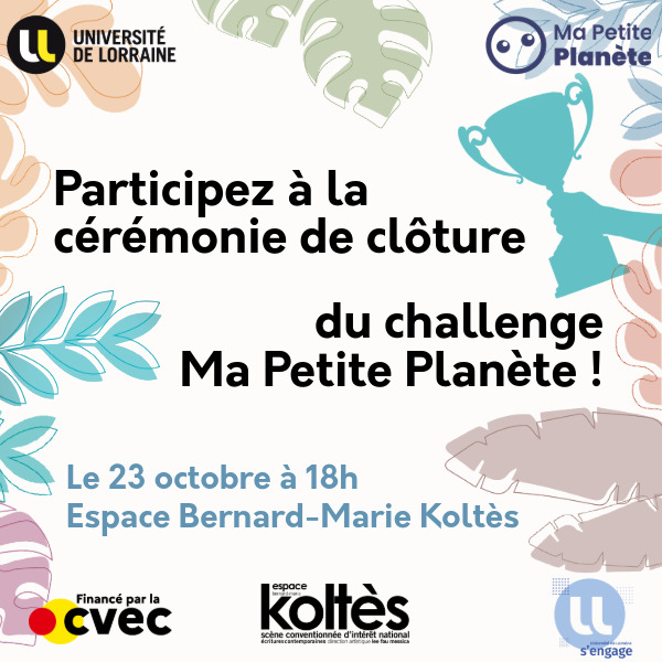 L’heure est venue de célébrer l’engagement et la mobilisation de toutes celles et ceux qui ont participé au challenge Ma Petite Planète. Nous vous invitons à une cérémonie de clôture conviviale, rythmée par une pièce de théâtre, la remise des prix aux équipes, mais aussi aux participants et participantes, les plus investies, et un cocktail dinatoire pour clore cette édition dans la convivialité et la bonne humeur.