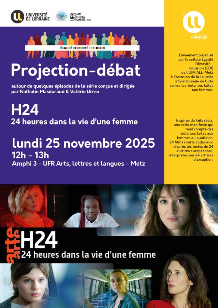 À l’occasion du 25 novembre, la cellule égalité, diversité, inclusion (EDI) de l’UFR Arts, Lettres et Langues de Metz organise une projection-débat autour de la série H24 – 24 heures dans la vie d’une femme, conçue et réalisée par Nathalie Masduraud et Valérie Urrea.