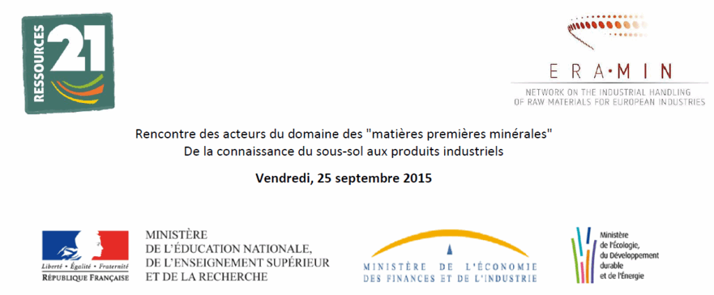Le Labex RESSOURCES21, ERA-MIN, le MENESR, le MEIN et le MEDDE se sont réunis cette année pour organiser ensemble ce rassemblement des acteurs français de la thématique des matières premières minérales permettant de réunir tous les membres de différents groupes miroirs français: ERA-MIN, PEI-MP, CSF, KIC,…