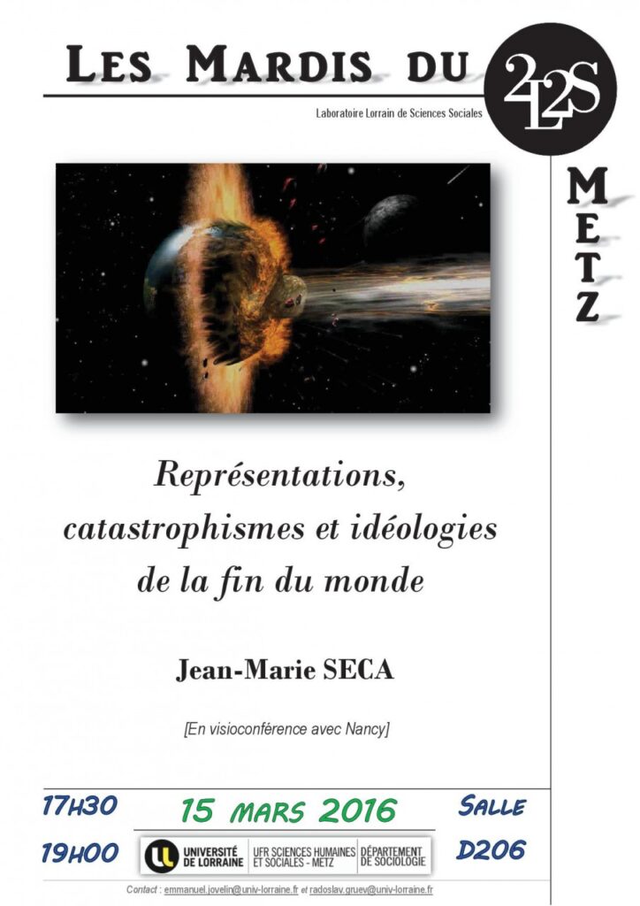 Nous aurons le plaisir d’écouter Jean-Marie SECA (professeur de sociologie à l’Université de Lorraine, site de Nancy), qui nous proposera une intervantion autour des « Représentations, catastrophismes et idéologies de la fin du monde ».