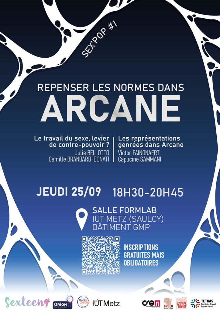 Rendez-vous le jeudi 25 septembre 2025 à 18h30 à l’espace Formlab à l’IUT de Metz (bâtiment GMP) pour une soirée sur la série Arcane. Accompagné·e·s de quatre chercheur·e·s en sciences humaines et sociales, nous parlerons des normes dans la série et plus particulièrement de travail du sexe et de représentations genrées.