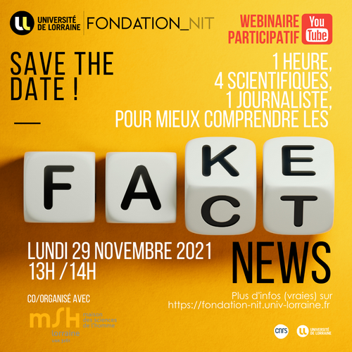 Cette table ronde sur le thème des fausses nouvelles, organisée par la fondation de l’Université de Lorraine et co-organisée avec la Maison des Sciences de l’Homme (MSH Lorraine), aura lieu le lundi 29 novembre 2021, de 13h à 14h en live sur la chaîne YouTube de MSH Lorraine ! Celle-ci sera donc disponible en replay sur cette même chaîne mais vos interrogations pourront être prises en compte durant le live grâce au tchat, ce webinaire étant participatif ! Rendez-vous ici pour cette table ronde !